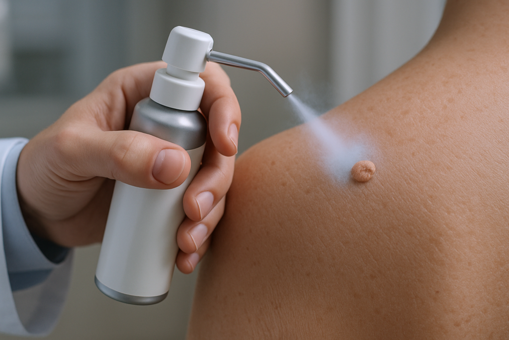 Cryotherapy is a non-surgical method used for treating many skin conditions including benign skin growths or viral warts. It is performed with liquid nitrogen achieving extremely low temperatures – up to minus 196 ° C. Depending on the thickness and type of skin change liquid nitrogen is applied directly through a special spray or swab for a few or maximum 60 seconds. In order to achieve a beneficial effect cryotherapy should be repeated every 7 to 14 days. After the treatment on the site where liquid nitrogen was applied a blister can be formed which will eventually result in epithelization.