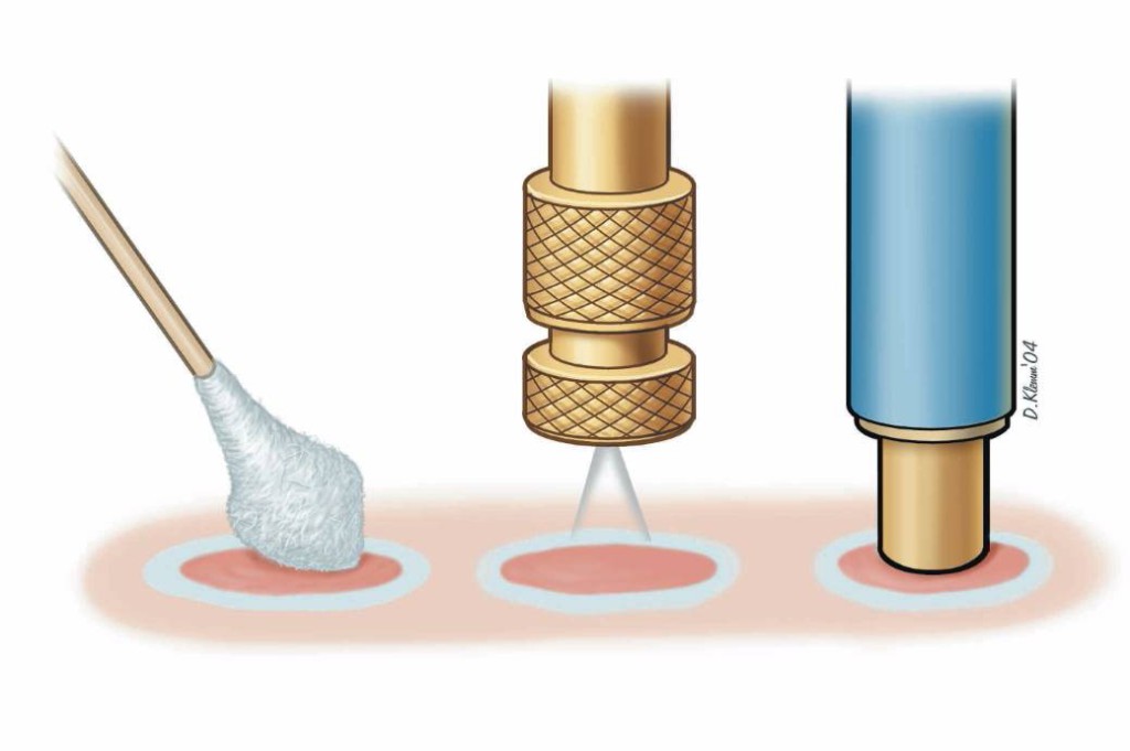 Electrocautery is an effective method for removing benign tumorous growths such as soft skin tags on the neck, armpit, genital and perineal region. By using very thin needles this method is also used in treating dilated capillaries (telangiectasia) on the face with excellent results.
